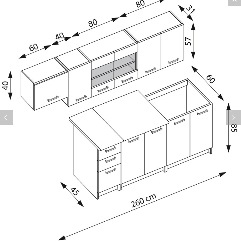 Perla - modern, 260 cm széles konyhabútor, nem magasfényű ajtókkal.
